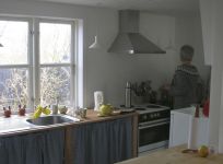 Køkkenet er fortsat et sommerhuskøkken, hvor opvask foregår ved håndkraft. Varmt vand, køleskab er der selvfølgelig.